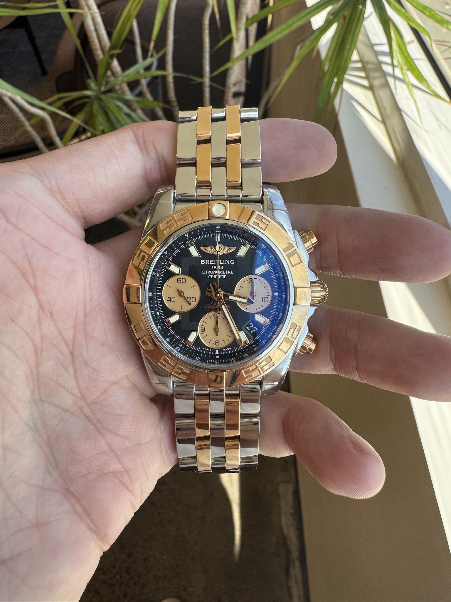 Insta tok or tube - timelordswatches or bendanniejewelry . We are a store in Los Angeles since 1978 Model: Breitling Chronomat 41 Reference Number: CB014012/BA53 (and related CB014012 variants)  Brand: Breitling Gender: Men’s  Case & Materials: • Case Diameter: 41 mm — a classic, versatile size that wears well on most wrists  • Case Thickness: ~15.4 mm  • Materials: Stainless steel and solid 18 kt rose gold case and bezel — two‑tone luxury finish  • Bezel: 18 kt rose gold unidirectional rotating bezel  • Crystal: Scratch‑resistant sapphire crystal with anti‑glare treatment  • Water Resistance: 300 m / 1,000 ft — robust protection for everyday wear and water activities  Movement & Performance: • Movement: Breitling Caliber 01 automatic chronograph movement — COSC‑certified chronometer for high precision  • Power Reserve: ~70 hours — excellent reserve for an automatic movement  • Jewels: 47  Dial & Functions: • Dial: Black (or other variants like silver or mother‑of‑pearl depending on specific subreference) with rose gold accents  • Functions: • Hours, Minutes, Seconds • Date window between 4 and 5 o’clock  • Chronograph (stopwatch) with sub‑dials for 30 min and 12 hrs plus running seconds  • Tachymeter scale for speed measurement  • Luminescence: Hands and markers glow in low light  Bracelet / Strap: • Two‑tone stainless steel and 18 kt rose gold bracelet with secure deployment clasp or optional leather strap in some variants  Overall Style & Appeal: The Chronomat 41 is one of Breitling’s most iconic sport‑luxury chronographs — blending tool‑watch functionality with elegant two‑tone styling. It’s equally at home with a suit or weekend casual wear, making it a versatile addition to any collection.