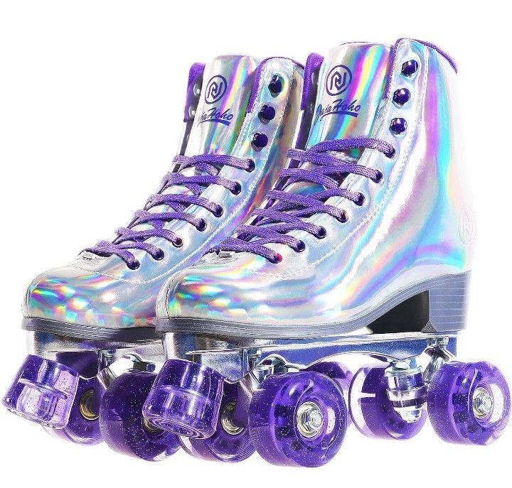 Roller Skates for Women, Holographic High Top PU Leather Rollerskates, Shiny Double-Row Four Wheels Quad Skates for Girls and Age 8-50 Indoor Outdoor Silver