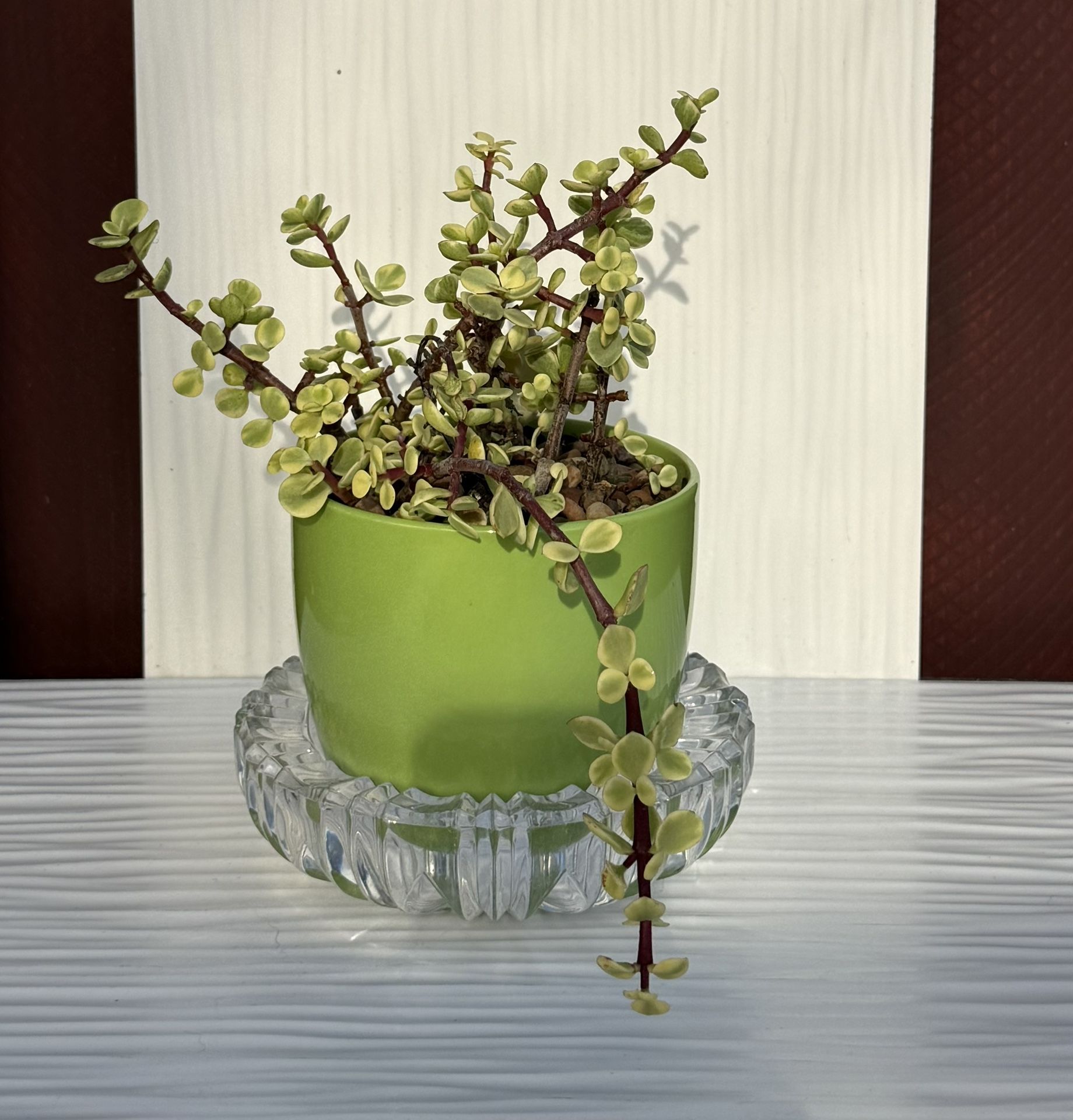 Bright Cheerful Green Ceramic Planter 4.75"H with Crystal Base/Saucer