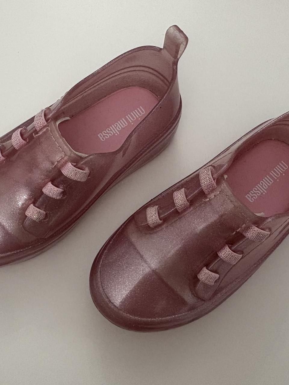 pink rubber, mini melissa, translucent, jelly sneakers, slip-on, playful, kid's style, glossy finish, pastel, cute