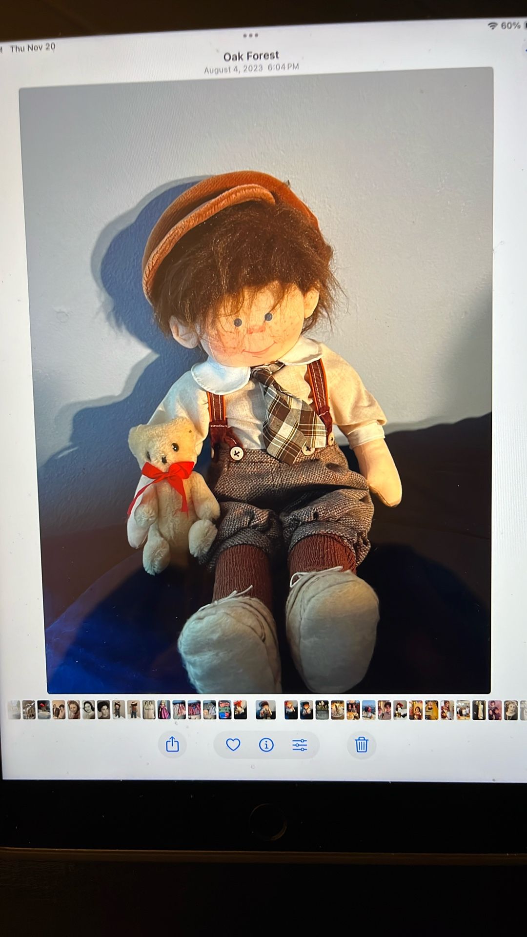 Wearing handmade shirt, tie, knickers, shoes, socks and hat holding a teddy bear. 16” tall.
