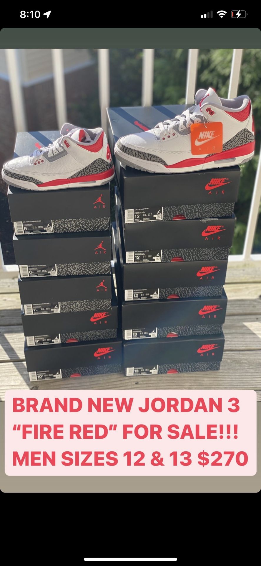 BRAND NEW JORDAN 3 “FIRE RED” FOR SALE!!! MEN SIZES 12 & 13 $270