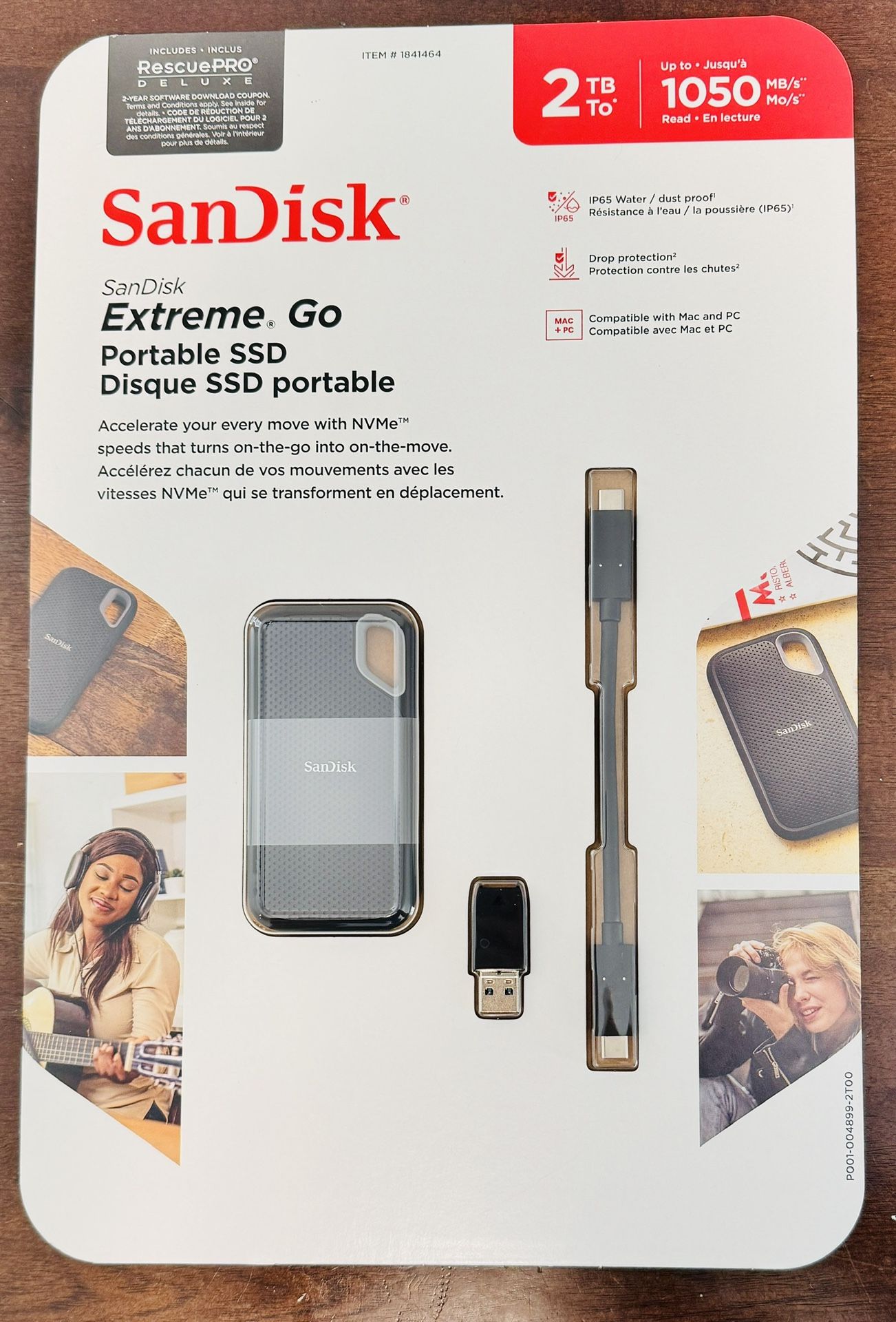 SanDisk Extreme Go Portable SSD, 2TB Features: -Fast NVMe™ Solid State Performance in a Portable, High-capacity Drive -Up to Three-meter Drop Protection and IP65 Water and Dust Resistance -5-Year Limited Warranty and a Durable Silicone Shell for Added Protection -Handy Carabiner Loop to Secure the Drive to Your Belt Loop or Backpack -Includes Hardware Encryption Plus Memory Zone™ File Management App For On-the-go Access