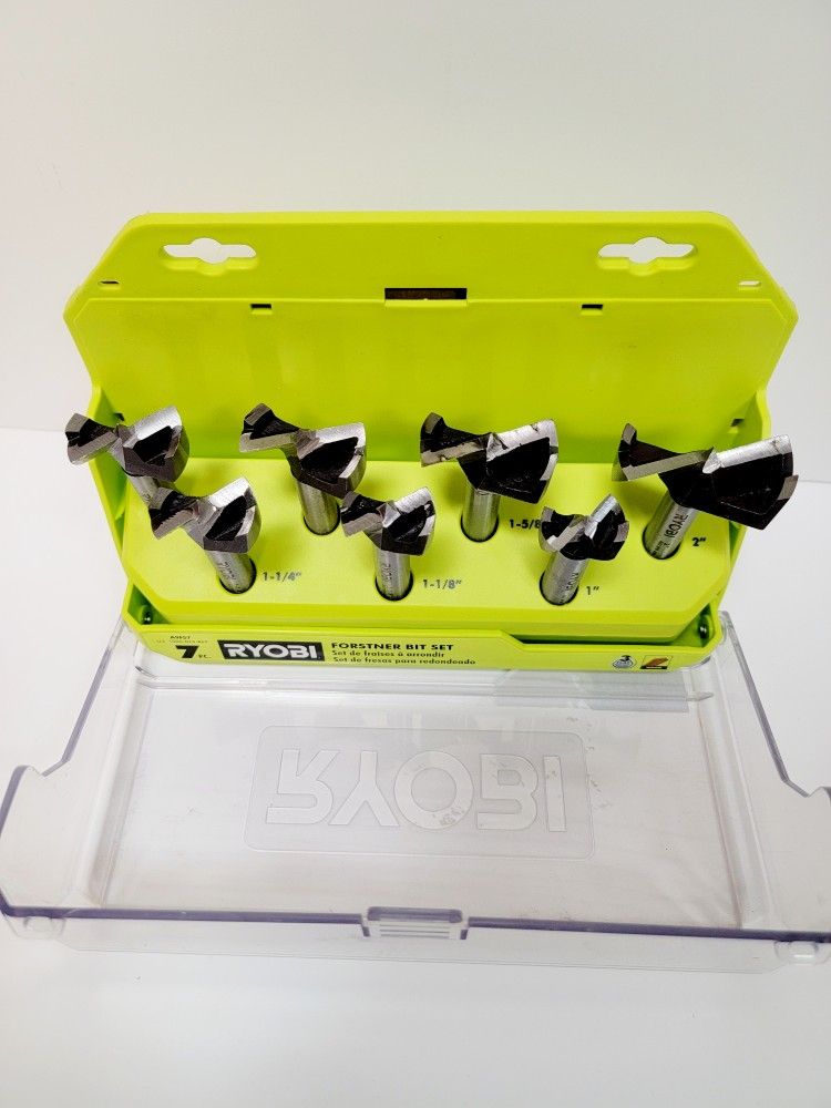 Ryobi Forstner Bit Set. Has 7 pieces for drilling clean, flat-bottomed holes. Comes with its original green case. Bit sizes include 1-1/4", 1-1/8", 1-5/8", 1", 2" and