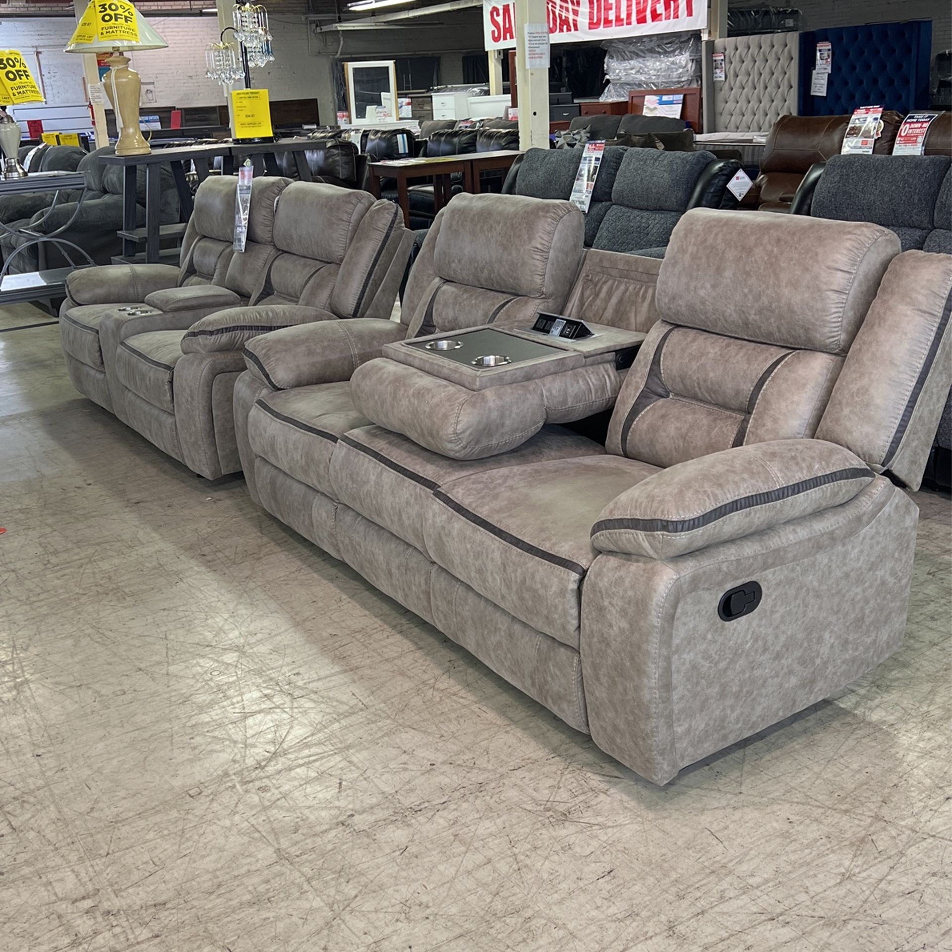 Acrópolis ash reclining sofa and loveseat set $1699.99 matching recliner for $499.99 financing available no credit needed