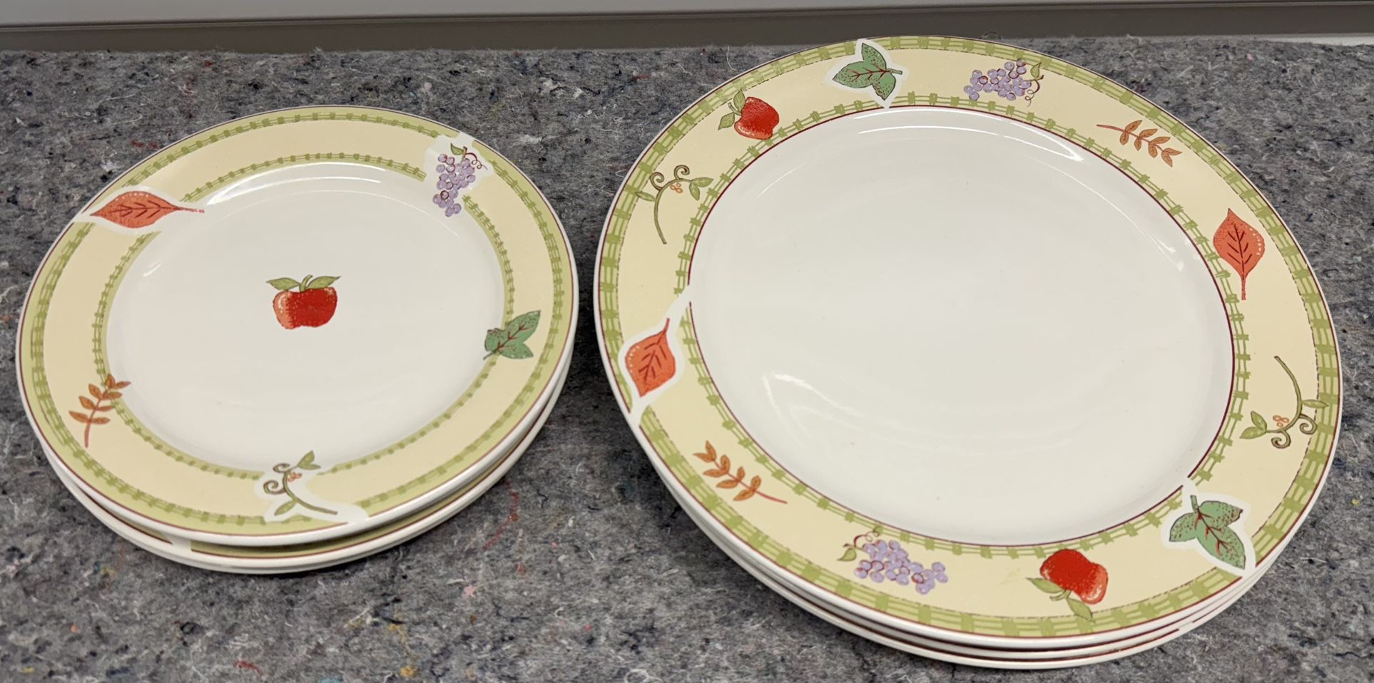 This is set of 8 pieces (4 Dinner plates and 4 salad plates.) Harvest Moon Majesticeware by Oneida. They are used and in good condition. With no cracks or scratches or chips. Please look at all the pictures. Must pick up in Northwest Austin off of Anderson Mill and Parmer Lane 78729.