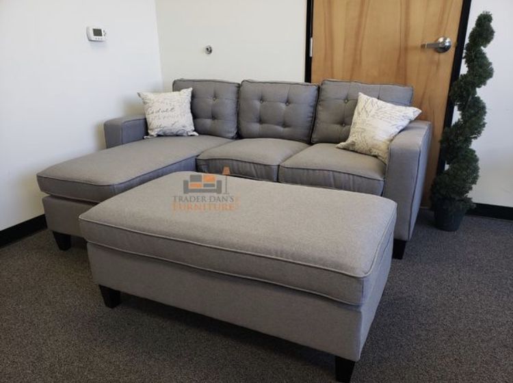 Brand new light grey linen Sectional Sofa with ottoman and 2 accent pillows. Comes new in the box. No assembly needed. Just attach legs. Reversible chaise can be used on either side. 81x60x34h. Delivery π for additional fee. Firm price