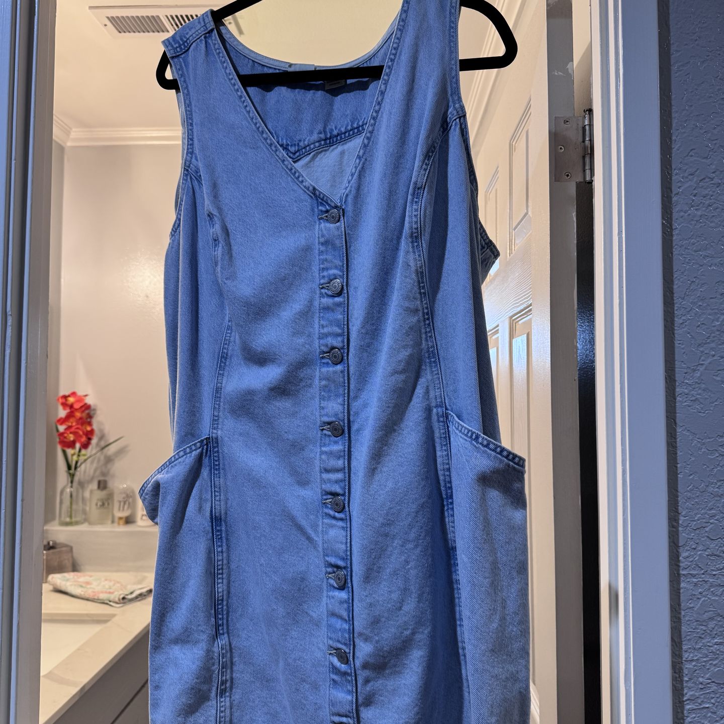 Stonewash style , V neck button front dress with cinch back to fit your body well. Brand new worn once. Size 3 x but fits more like 16. Adorable and can be worn with fitting t- shirt under for cute style. Knee length and very comfortable.