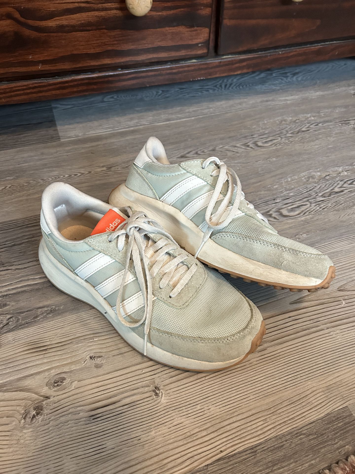 Moving & must go! Make an offer. Adidas Run 70s green/white shoes with orange accents. Worn 2-3 times, in great condition. Lists a size 7 but i wear a 7.5-8 and they fit me great. You pickup! Located near Springfield high school.