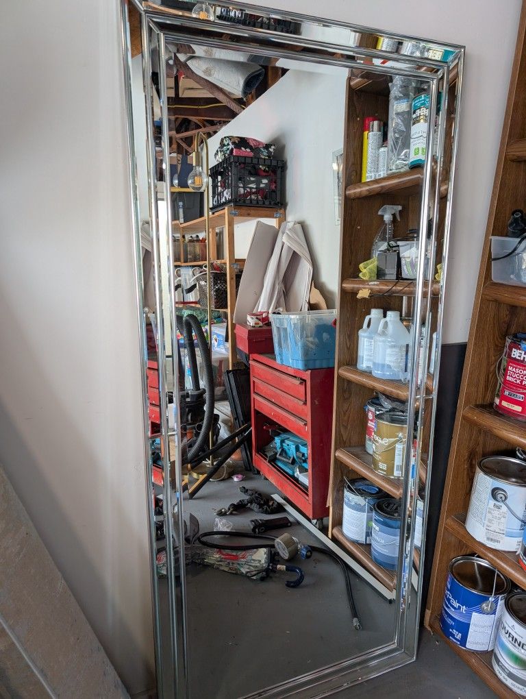 Beautiful full-length mirror with beveled edge frame. Dimensions: 24” wide x 58” tall Sleek chrome/silver trim for a modern look Can be leaned against a wall or mounted Perfect for bedrooms, entryways, closets, or living spaces In excellent condition, no cracks or chips. Price: $60 OBO Category: Home → Mirrors & Wall Décor Pickup: North Park