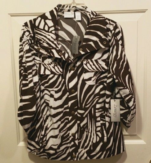 Chico' Zenergy Zebra print Jacket -NWT Adjustable sleeves with pulls;can wear 3/4 - full arm length. Adjustable pulls around neck. 2 front pockets & 2 Side pockets. Metal snaps. Colors: Chocolate Brown & White Size: Small (Chico's: 0) Excellent condition - brand new. Downsized a parent & no longer needs. See pictures for details Cash only please