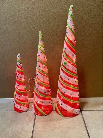 3-piece assortment Cone sizes measure 39 in., 31 in. and 24 in. Pre-lit with 65 total UL listed clear lights For indoor or covered outdoor display