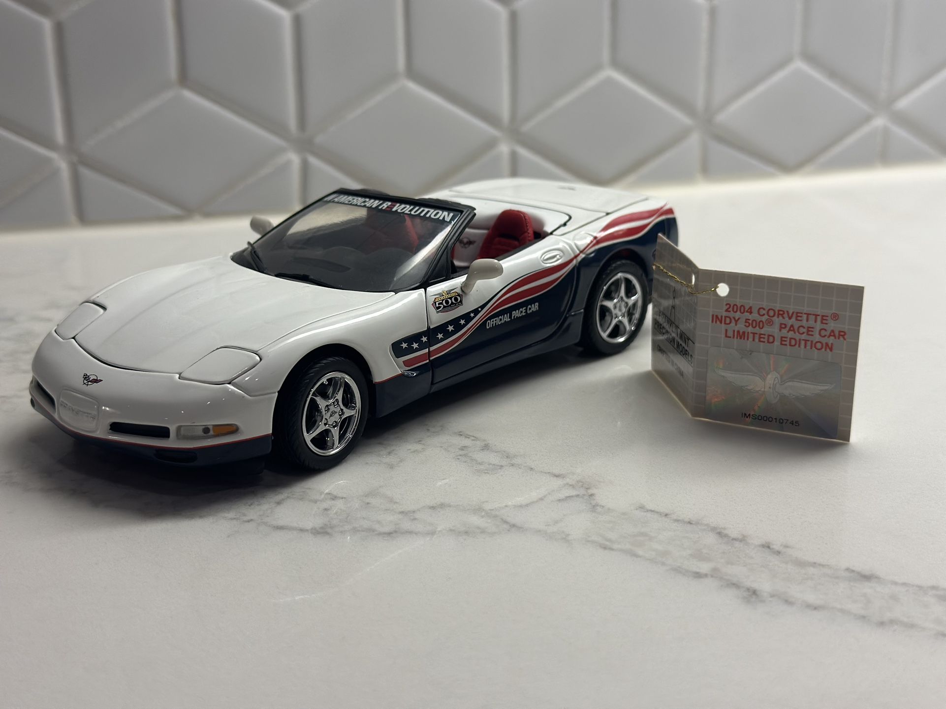 #1487 of 5000 made. Missing Roof, but in perfect condition. This limited edition Franklin Mint 2004 CORVETTE INDY 500 PACE CAR is a must-have for any car enthusiast. The striking red/white/blue design and Chevrolet make make it a true standout. The 1:24 scale and diecast material ensure intricate details and a high-quality finish, making it a great addition to any collection. This vehicle is part of the Pace Car series and was manufactured in 2004, making it a contemporary piece. It features the iconic Indianapolis 500 theme and is a great piece for collectors of all ages. Don't miss your chance to own this one-of-a-kind piece!