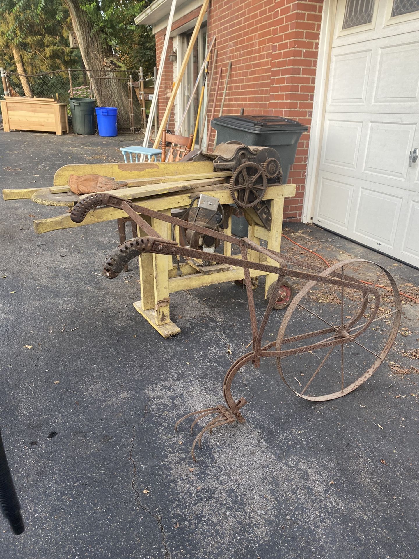 Fodder chopper, corn shucker, hand plow, skeet shooter, seeder, shovels, antique trunks MAKE OFFER!!!!!! NOT FREE! NO REASONABLE OFFERS REFUSED!