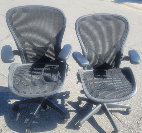 Newer Style Herman Miller Aeron Office Desk Chairs Has posture fit lumbar support Has upgraded heavy duty pneumatic hydraulic cylinder which will last longer than normal hydraulics you can tell by the metal sheath around the post These are the cleanest and the best shape you can get being a classic Venmo, Zelle, Cash, CC, Cash App Size B These are newer style classics which means they have the clips for the adjustable arms. The older style have the wheels for the adjustable arms Free delivery within reason Fully loaded and just about perfect paint No blemishes or issues All mechanisms work perfectly