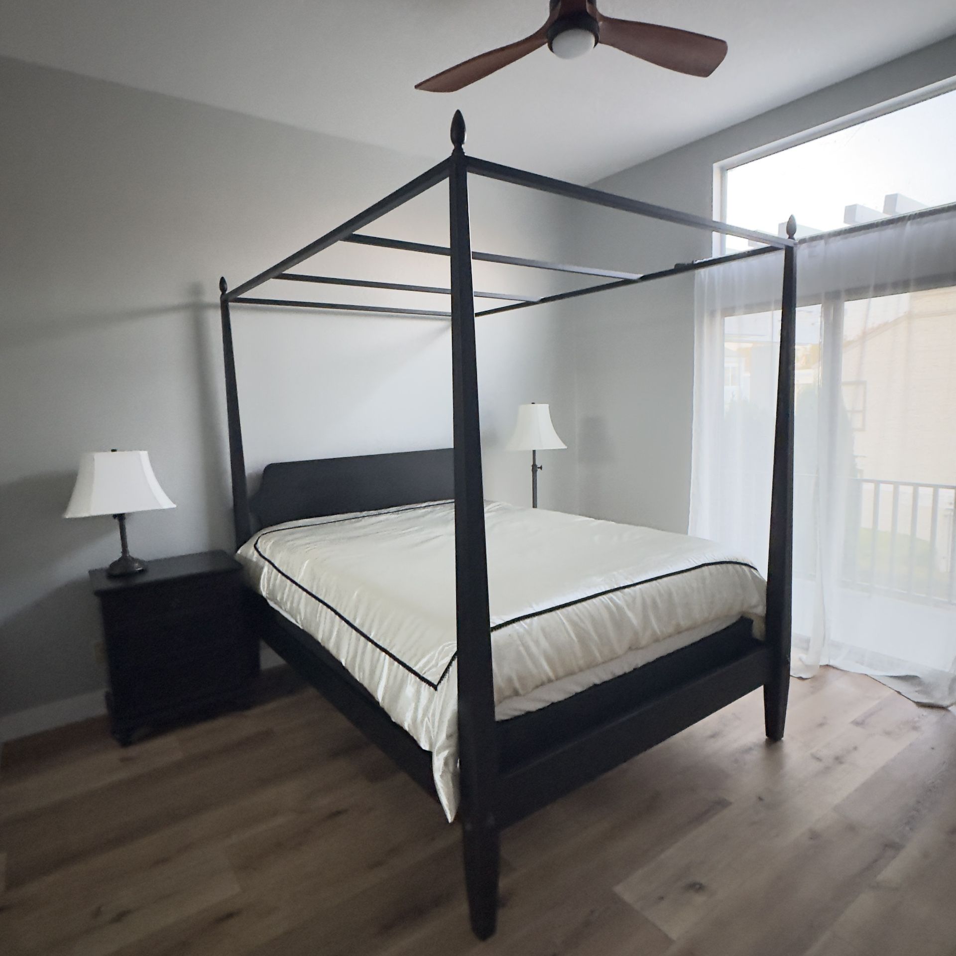 Gorgeous Ethan Allen four-poster canopy queen bed in sleek black finish – the perfect statement piece for a sophisticated, modern bedroom! This elegant canopy frame features tall, sturdy posts with classic finials, creating that dreamy draped look (drapes not included, but easy to add sheer panels or lights for romance). • Queen size – fits standard queen mattress (mattress not included) • Rich matte black walnut construction – timeless and versatile, pairs beautifully with gray walls, white linens, or bold accents • Includes headboard/footboard frame with canopy top • Immaculate condition – barely used, no major scratches/dents (light signs of normal wear only) • Dramatic mirrored wall setup in photos shows how it commands the room (mirrors not included) Originally a high-end Ethan Allen piece (retail for similar poster/canopy beds often $2,000–$4,000+ new), this is your chance to snag luxury at a fraction of the price! Moving/moving on – priced to sell FAST. Asking $400 (or best offer – serious buyers only, cash/PayPal/Venmo). Pickup in Irvine area – bring help to disassemble/load if needed (breaks down easily). DM for more photos, measurements, or to snag it before it’s gone!