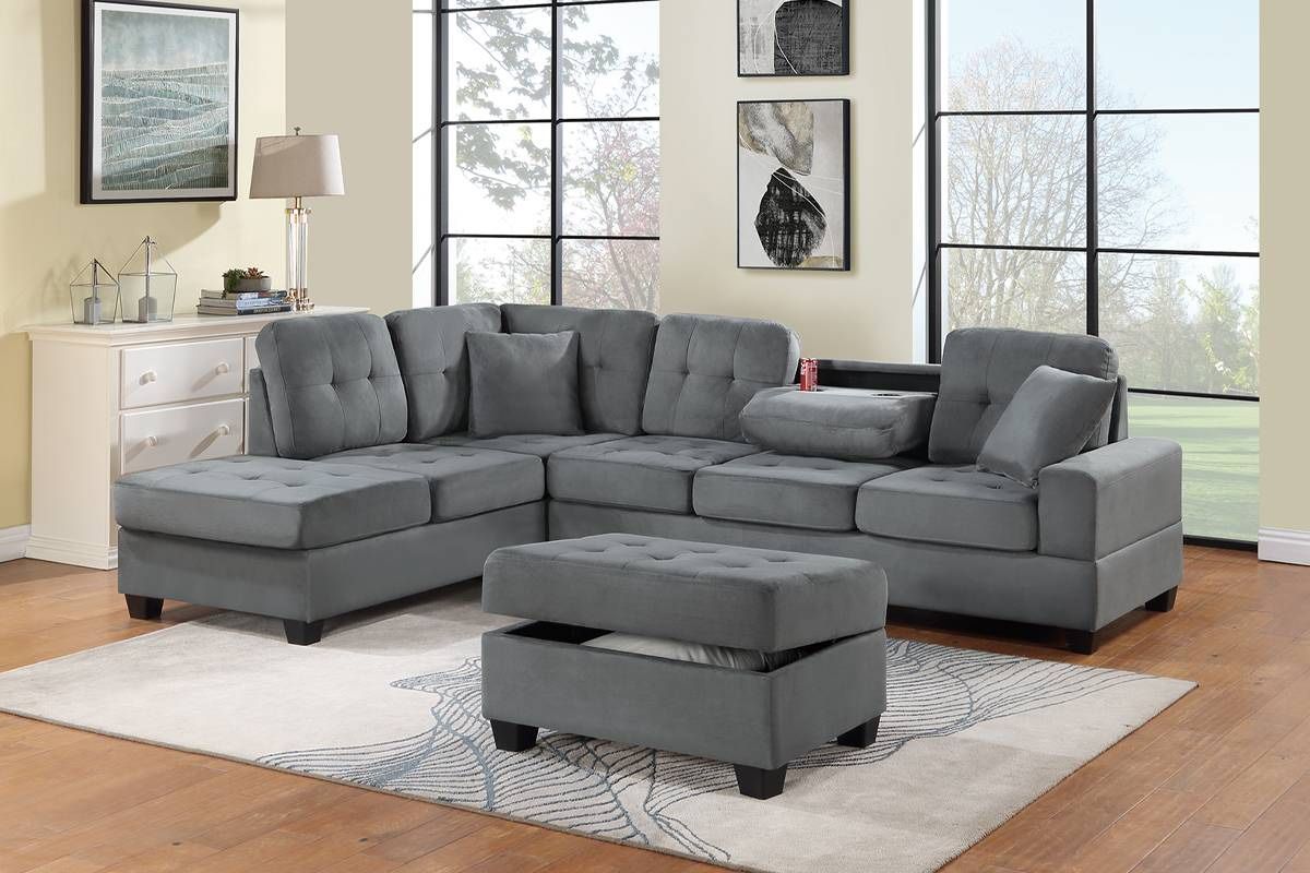 Delivery 🚚 available Pickup available Financing available 100 days no credit needed no interest All items sold as new only This sectional is everything you'd ever want in your living space; it comes in a neutral tone that matches almost any style or color scheme. With medium-firm seat cushions, and subtle biscuit tufting back and seat cushions, add the traditional feel we love. A special addition is the hidden cupholder in the middle sofa back cushion and a storage space in the ottoman. This sectional includes two matching throw pillows, a reversible chaise, 3-seater sofa, two built-in cup holders, and a matching storage ottoman. Available in multiple colors. Reversible Chaise: 80" x 33" x 35"H; Sofa: 78" x 33" x 35"H; Cocktail Ottoman: 33" x 24" x 18"H