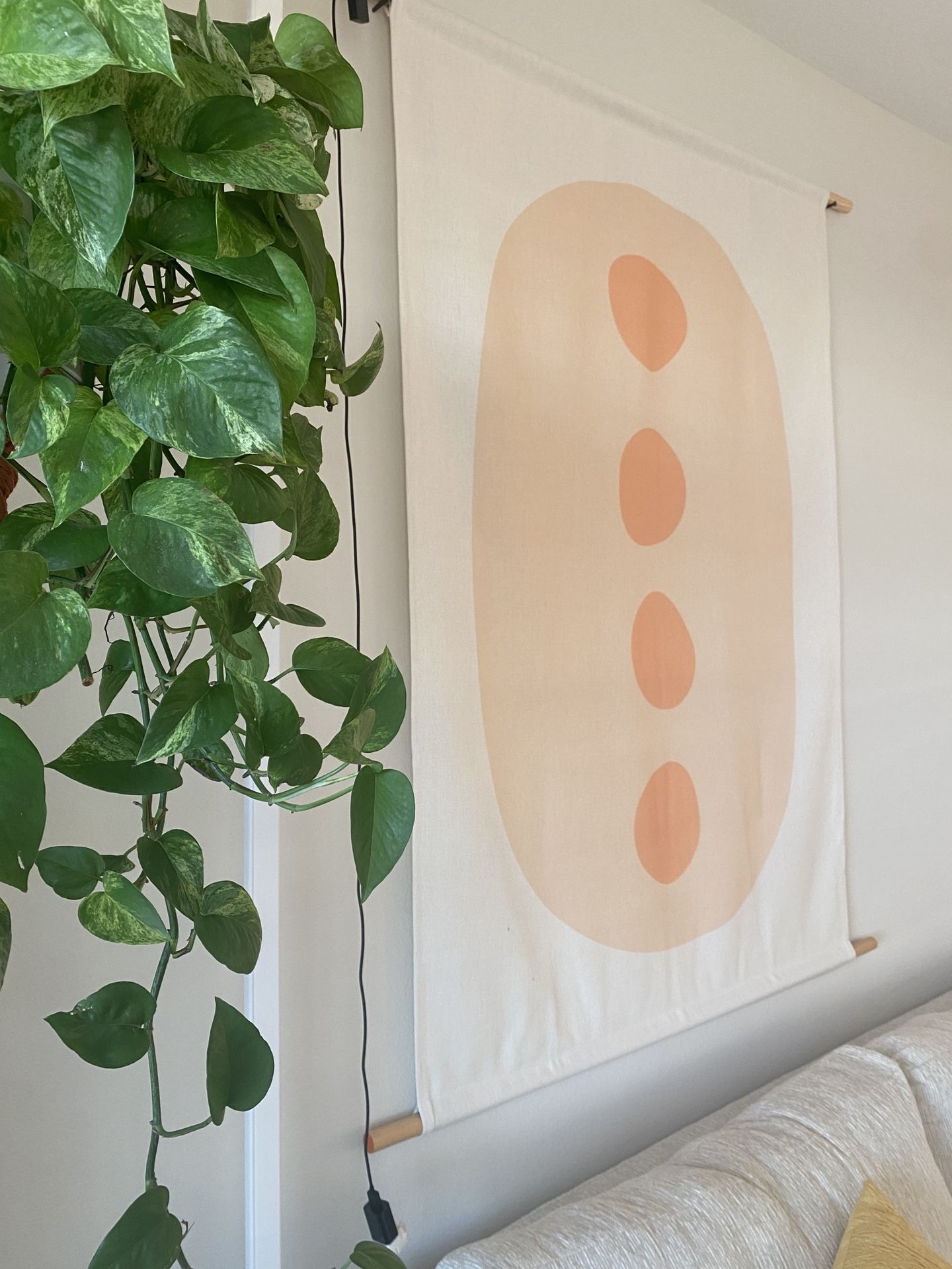 Boho tapestry for wall, made of cotton and hemp blend. Size: 41.5x61” Needs to be ironed and looks best facing window. Comes with wooden dowels and two iron nails for hanging. If you just want the tapestry and no dowels or nails I would $30 for it. Message me if interested, I have a few other designs as well!