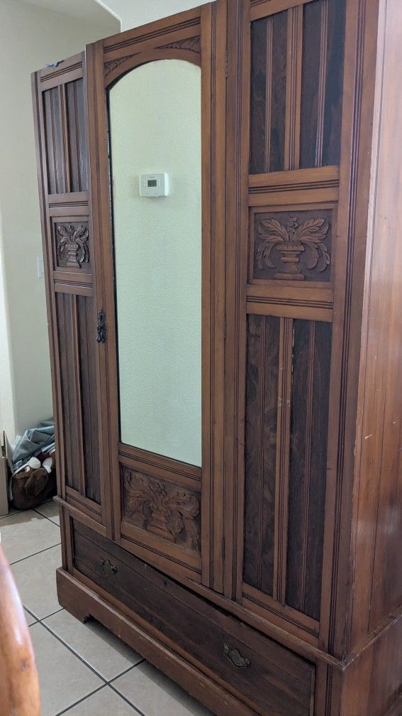 Nice wardrobe with a look that you'll like, it has for hanging clothes and hooks for other things it also has a large drawer. Needs some work , about 6'T 4'W .