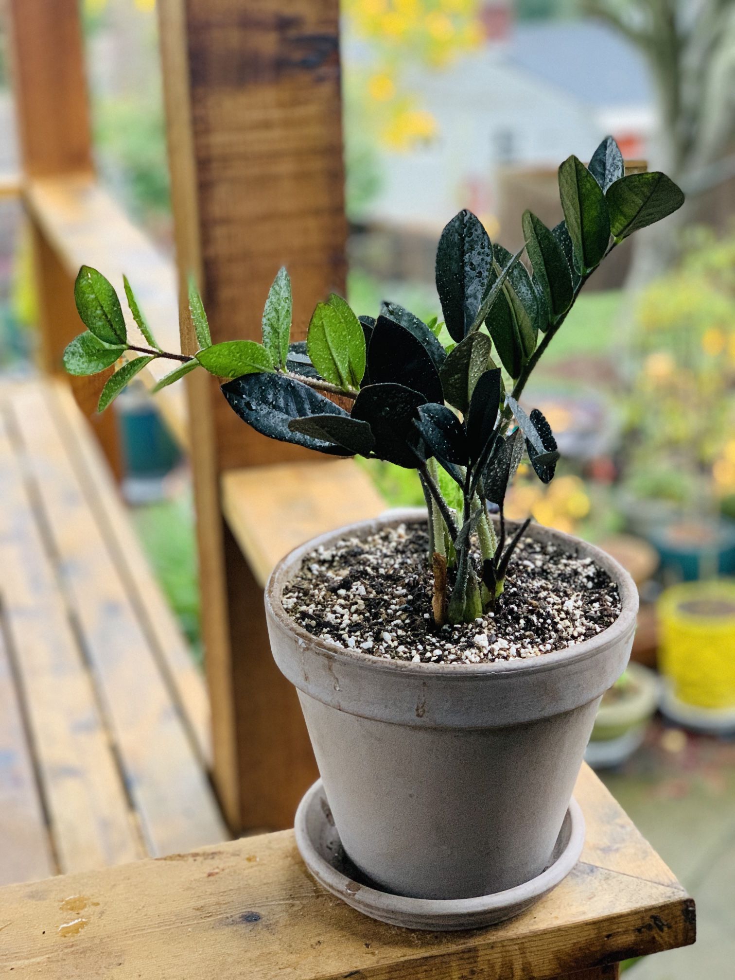 Live indoor Raven ZZ plant in a brown terra cotta planter pot with base included—firm price