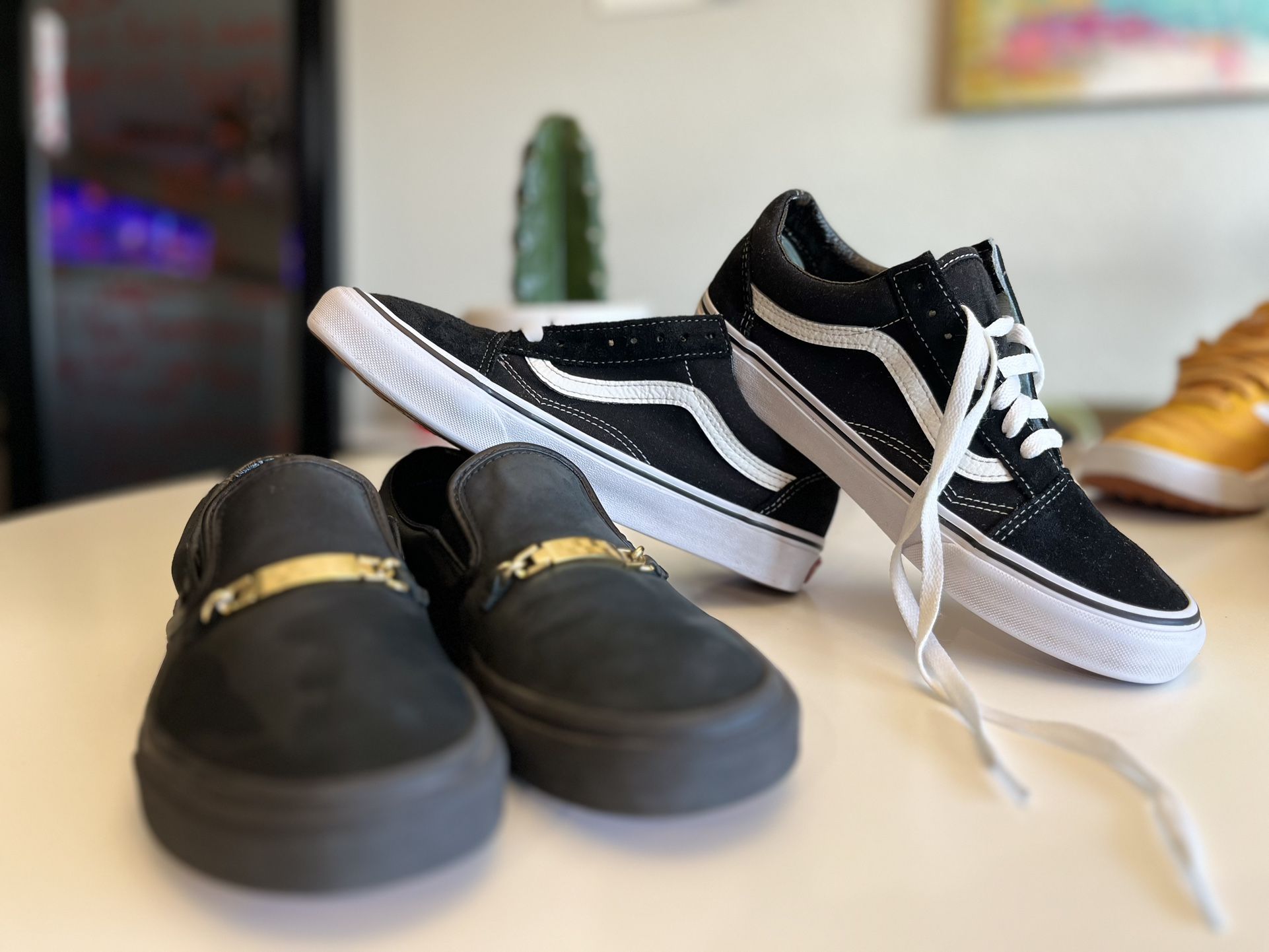 These are some rare suede slip ons with gold metal vans tag size 6.0M 7.5W Also “vans old skool” size 6.5M 8W the classic suede and canvas black lace up. Like new. Comfortable insoles on both pairs. Will adjust price to cover shipping.