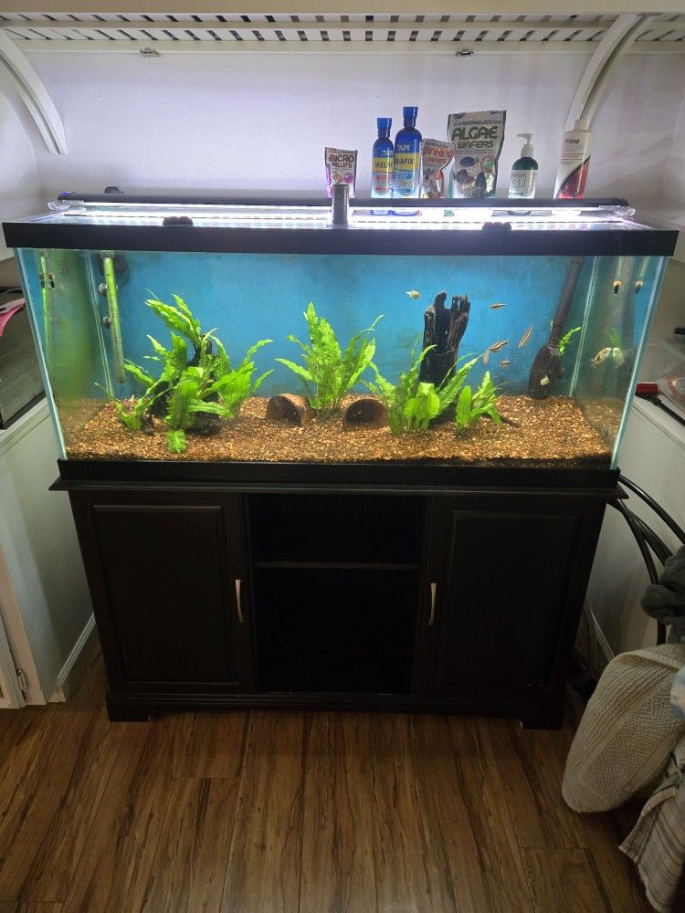 75G aquarium with stand, Fluval FX6 canister filter with spray bar, glass top, Finnex LED programmable 24-hour live plant light, live plants, Malaysian driftwood, 150W heater.