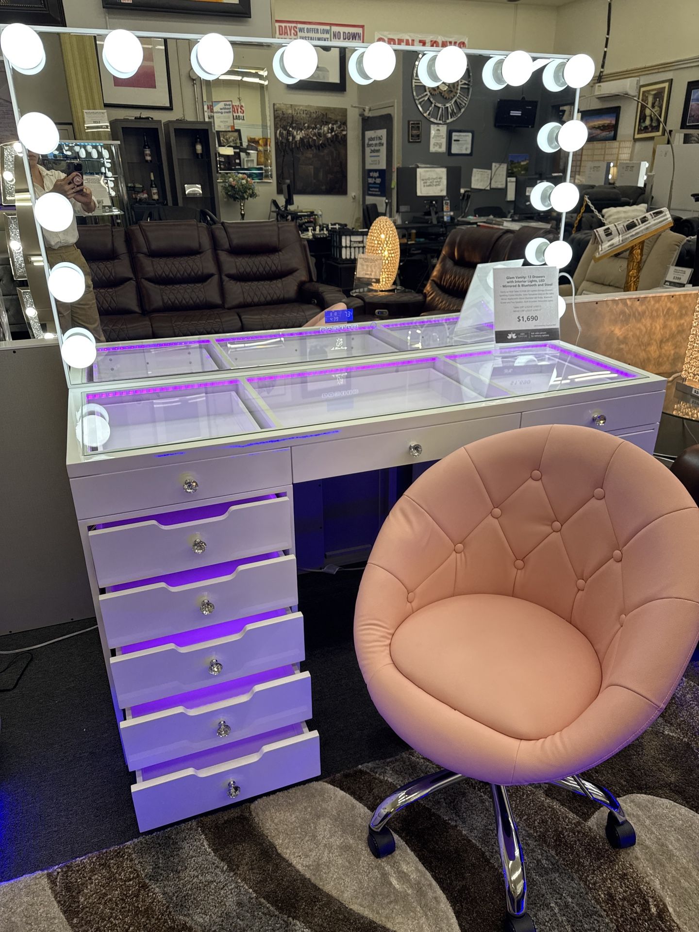 New Glam Vanity: 13 Drawers with Interior Lights, LED - Mirrored & Bluetooth and Stool