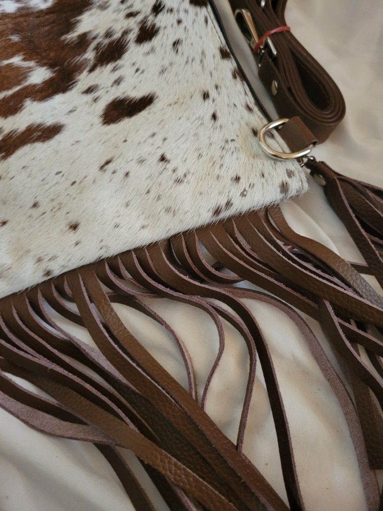 real cowhide crossbody purse 9" wide x 8" tall outside pocket white and brown fur on one side plain brown leather on other side side leather fringes