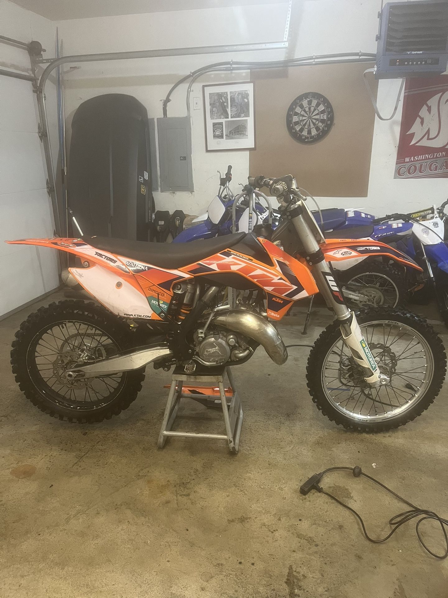 Here I have for sale my ktm 150sx I love this bike and am sad to sell it but don’t use it enough I’ve have it for 2 years and ridden it a total of 3 times. Can’t justify keeping it since I don’t ride it enough. I am a little flexible on the price. If you have any questions about the bike feel free to reach out and ask Pros: Has a fresh top end with about 5 hours on it newer air filter with only 2 rides on it Newer front and rear sprocket with 2 rides on them also Newer chain Newer grips Tires in good shape Comes with extra rear tire Runs well Starts first or second kick Just cleaned the carb Cons: Minor cosmetic defects such as a few scrapes on the plastics and 2 small dents in the pipe Clutch lever had the tip of it snapped off before I got it and I never got around to changing it because it still works just fine
