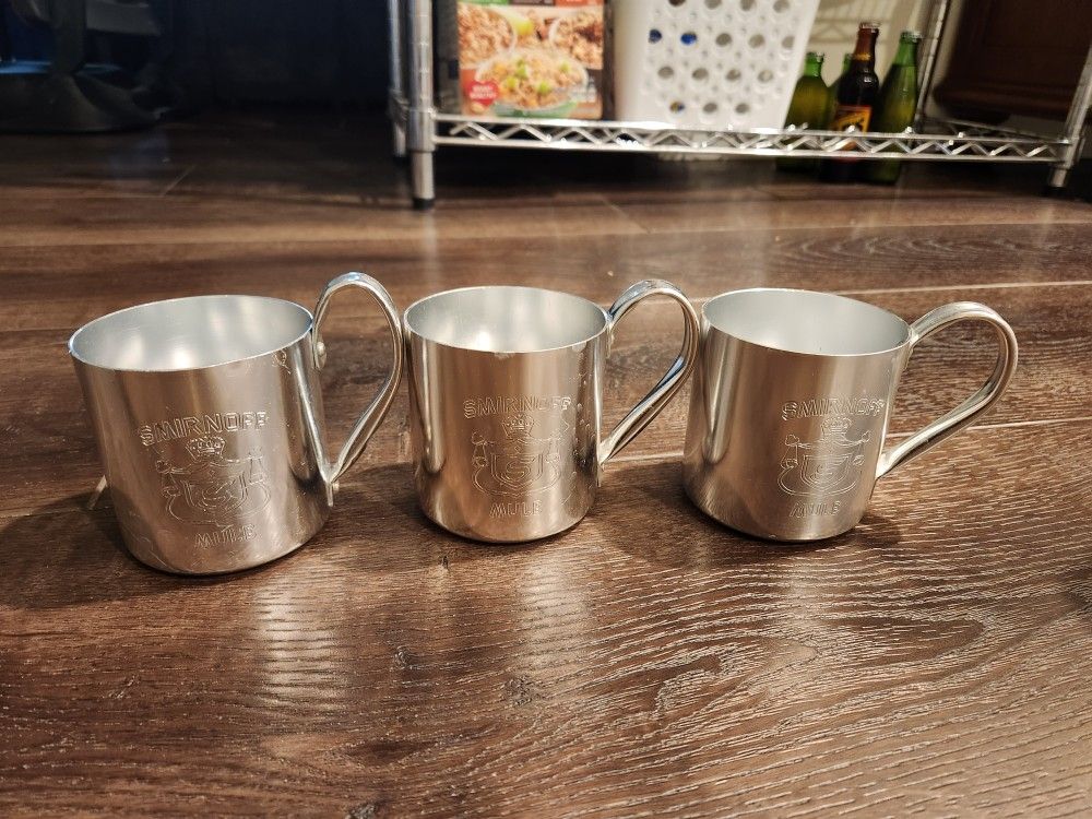 set of 3 vintage Smirnoff Moscow Mule mugs, made of copper-tinted aluminum.