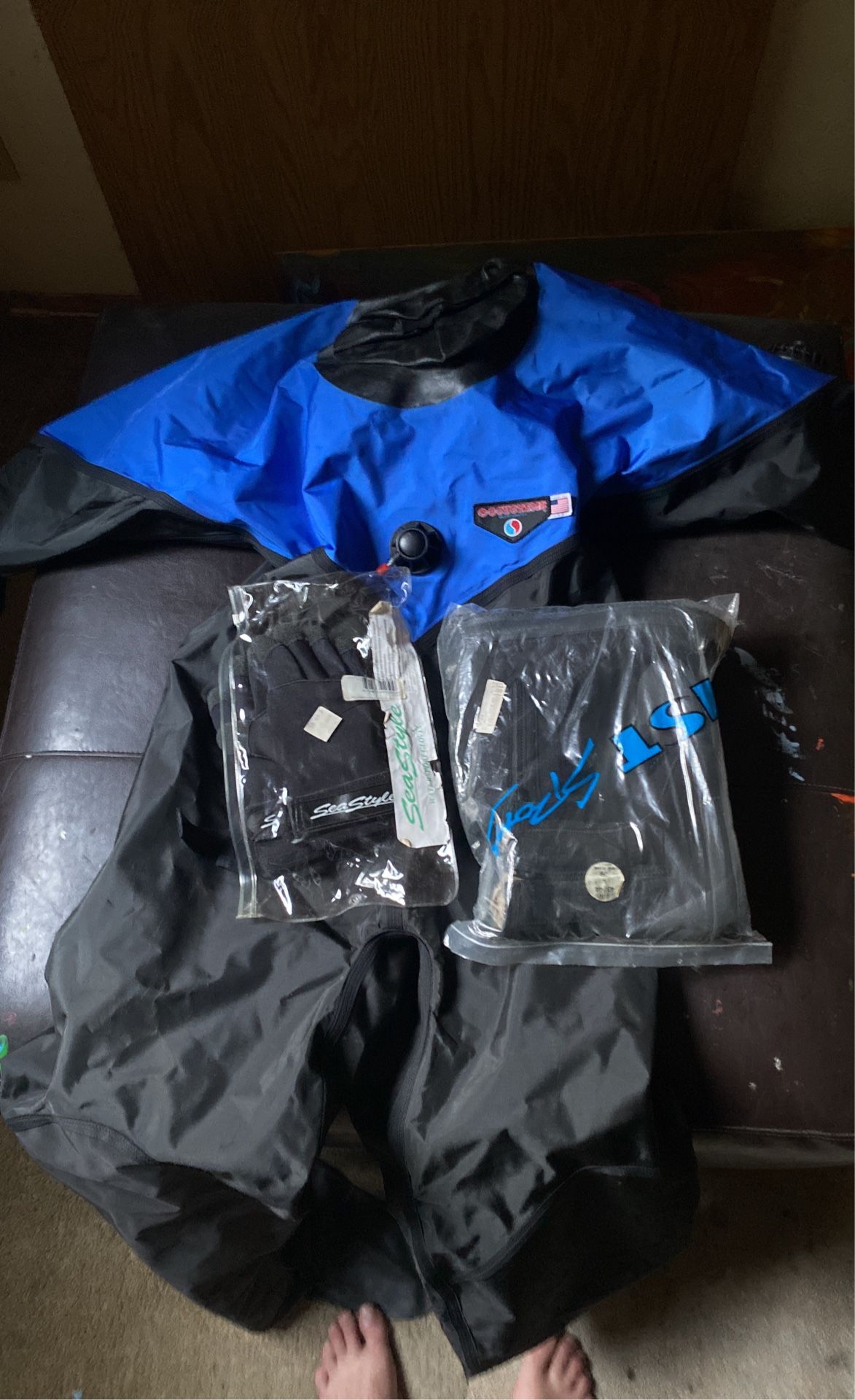 Brand new blue and black size xl men’s diving suit, I’m 6 foot 3 and it fits me snug, It does not come with the oxygen tank but it has the suit and the shoes size 10 shoes and gloves included