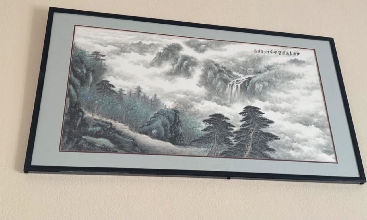 Large Chinese Landscape Painting – Waterfall, River & Mountain with a Black Frame.