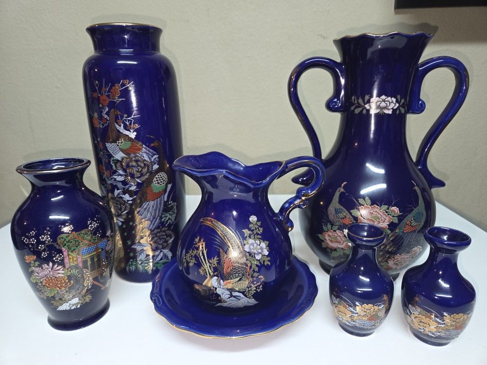 This is a collection of vintage Japanese cobalt blue porcelain vases with gilded floral and pheasant designs. 7 pieces- $80 Made in Japan, commonly produced in the mid-to-late 20th century. Features a hand-painted scene of a traditional Japanese rickshaw or carriage surrounded by flowers and foliage. The set appears to include various styles, such as bud vases, a pitcher-style vase with a handle, and taller vases. They feature a deep cobalt blue glaze and are decorated with intricate gold-gilded patterns of flowers and birds, possibly pheasants. These items are often considered collectibles and fall under the category of home decor. The vase features intricate details in enamel and gold gilt. It often stands around 10.5 to 15 inches tall.