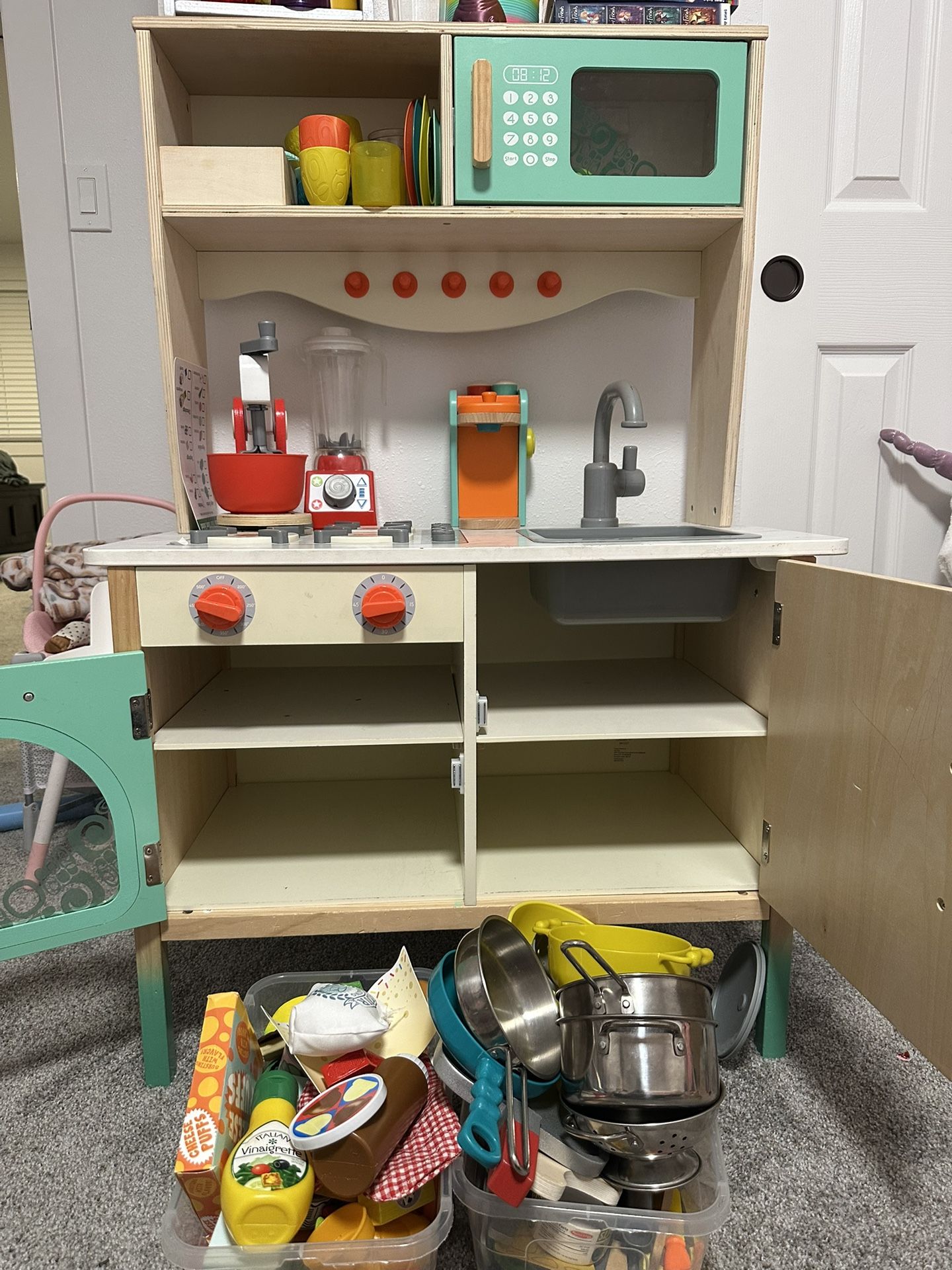 B Toys Play Kitchen with multiple Kitchen sets, pots & pans, wooden food, etc Put together not taking apart, pick up only