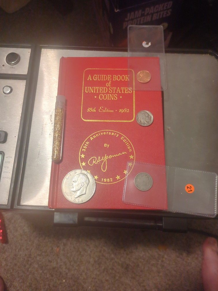 Intro to Coin Collecting Starter Set Great beginner bundle for anyone interested in coins. Includes: • 1982 “Red Book” coin price guide • 1936 Buffalo Nickel • 1907 V Nickel • 1971-D Eisenhower Dollar • 2009-D Lincoln Penny • Novelty 24k gold flake vial Nice mix of vintage U.S. coins and learning material. Perfect gift or starter collection. Local pickup.