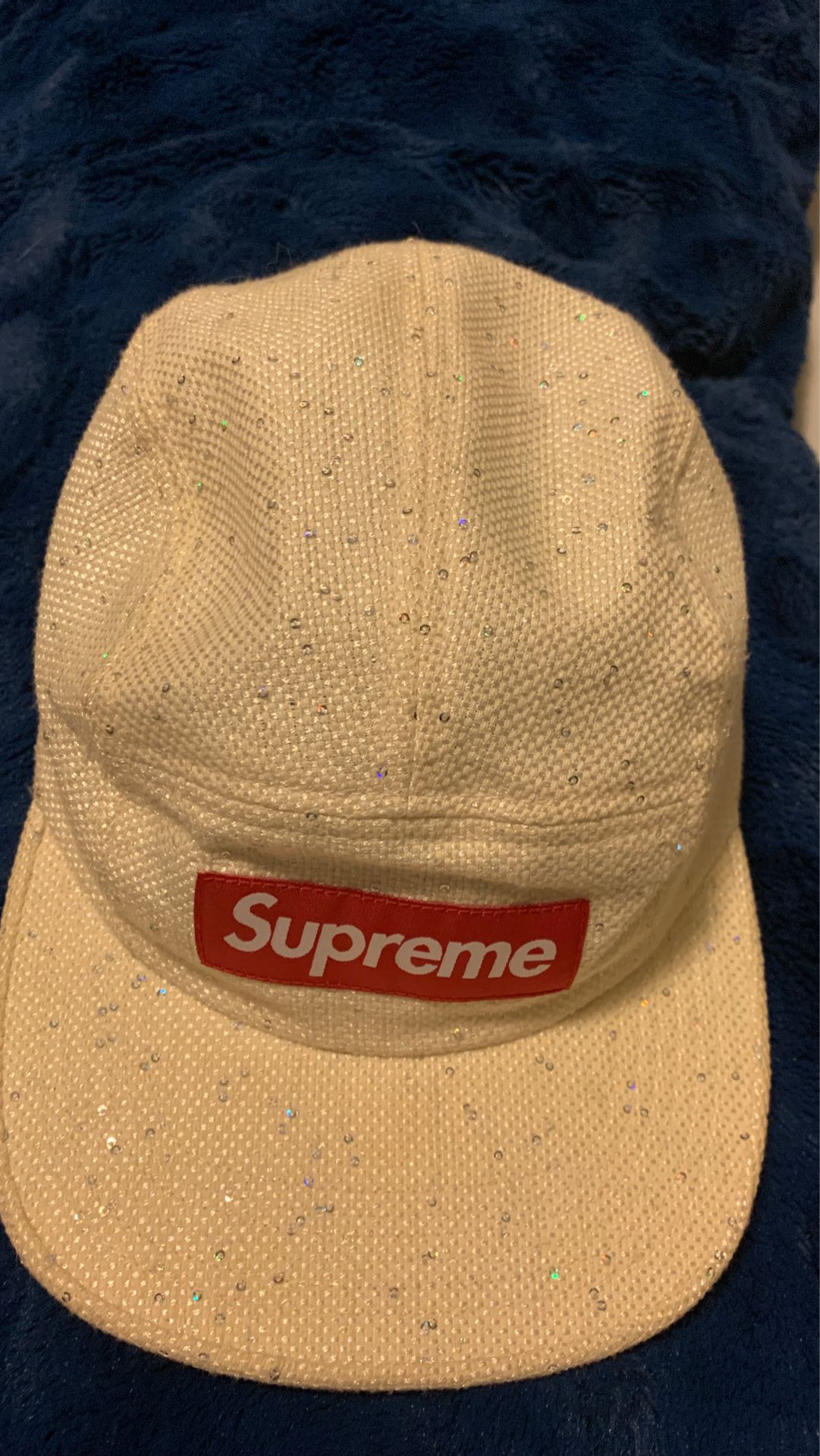White sequins hat with sparkles and in good condition only worn part is inside on forehead stain other than that no stains