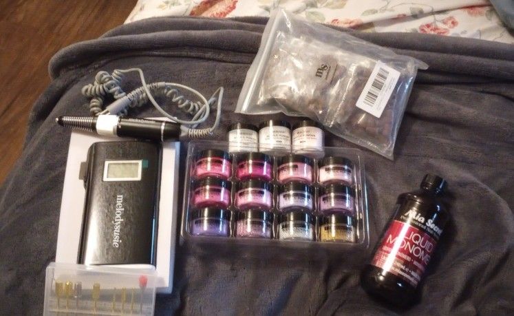 Comes with the melody Susie scamander rechargeable nail drill (30000), Modelones acrylic powder set (12 piece) plus 3 morovan ones. Mia secret monomer, an eternal acrylic top coat and a bag. Drill has been been used one time and some of the powder and monomer are
