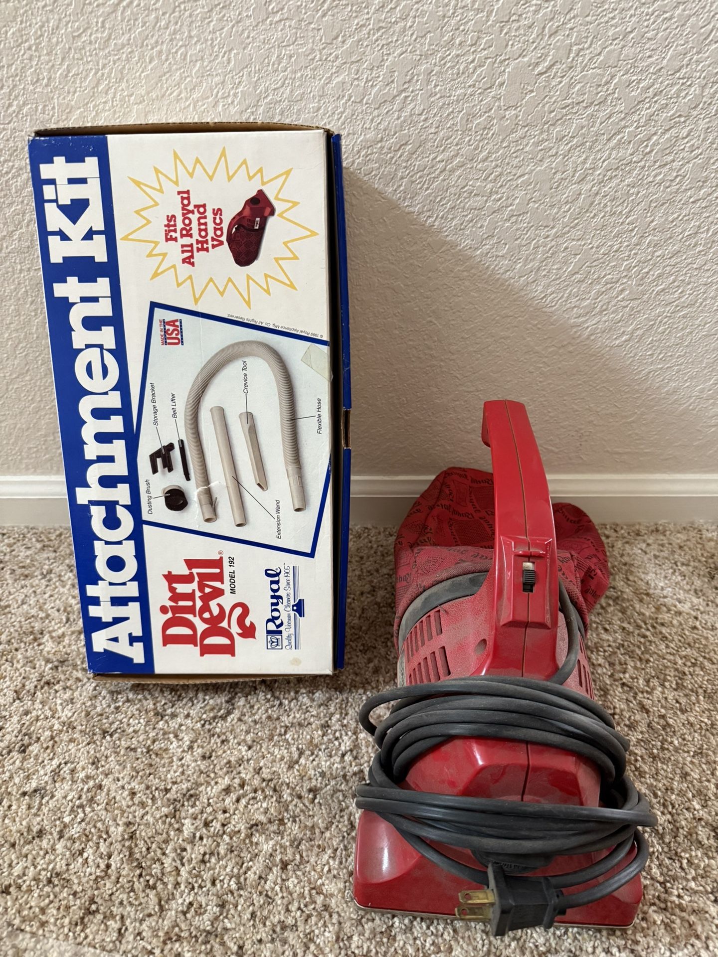 Red Dirt Devil handheld vacuum cleaner with cord. Includes a full attachment kit with everything pictured on the box.