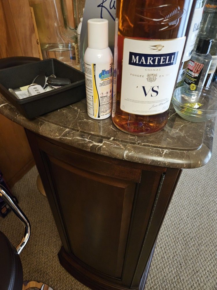 The bar came from Haverty's furniture store stone Crest mall. Paid over 1500 hundred dollars. The top ๐ฏ Granite top and have one doors on each side of bar. Have two drawers in back of bar. Two wine doors in back of bar and one sliding tray in back of bar to serve drinks ๐ธ. The bar and chairs like new condition. Ready to be pickup anytime.