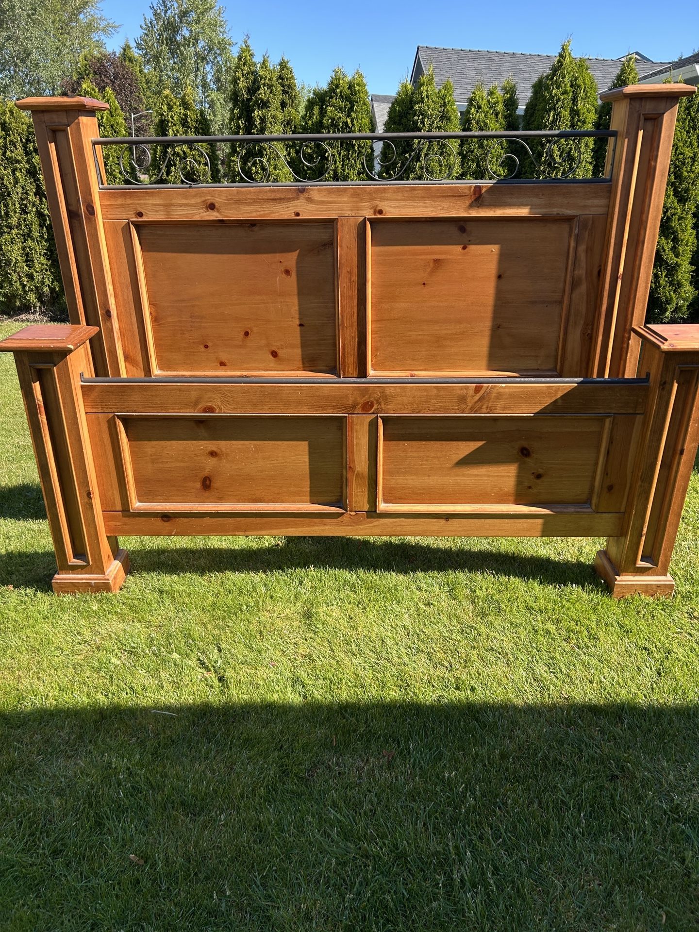 Queen Bed Frame .. headboard, footboard and side rails … no slats for middle support we had an adjustable bed on its own frame. slats can easily be purchased if needed. Solid Wood .. no particle board pcs.