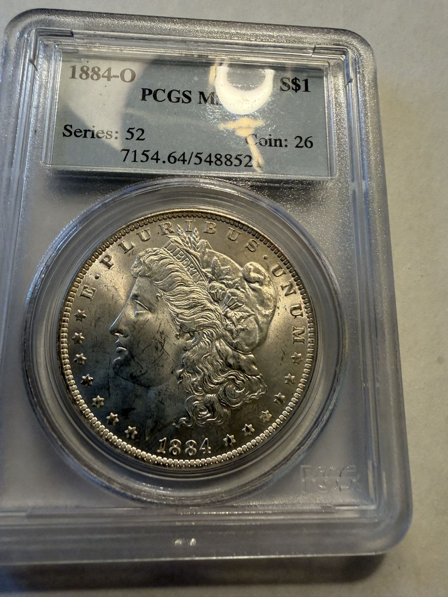 Offered for sale is an authentic 1884-O Morgan Silver Dollar, professionally graded and encapsulated by PCGS. Details: • Year: 1884 • Mint: New Orleans (O) • Denomination: $1 Silver Dollar (Morgan) • Composition: 90% Silver, 10% Copper • Grade: PCGS Mint State • PCGS Cert #: 7154.64 / 548852 • Series: Morgan Dollar (Series 52) Highlights: ✔ Original Mint State example ✔ Strong detail and luster ✔ PCGS certified – authenticity guaranteed ✔ Popular and collectible New Orleans issue This is a classic U.S. silver dollar, perfect for collectors, investors, or as a gift.