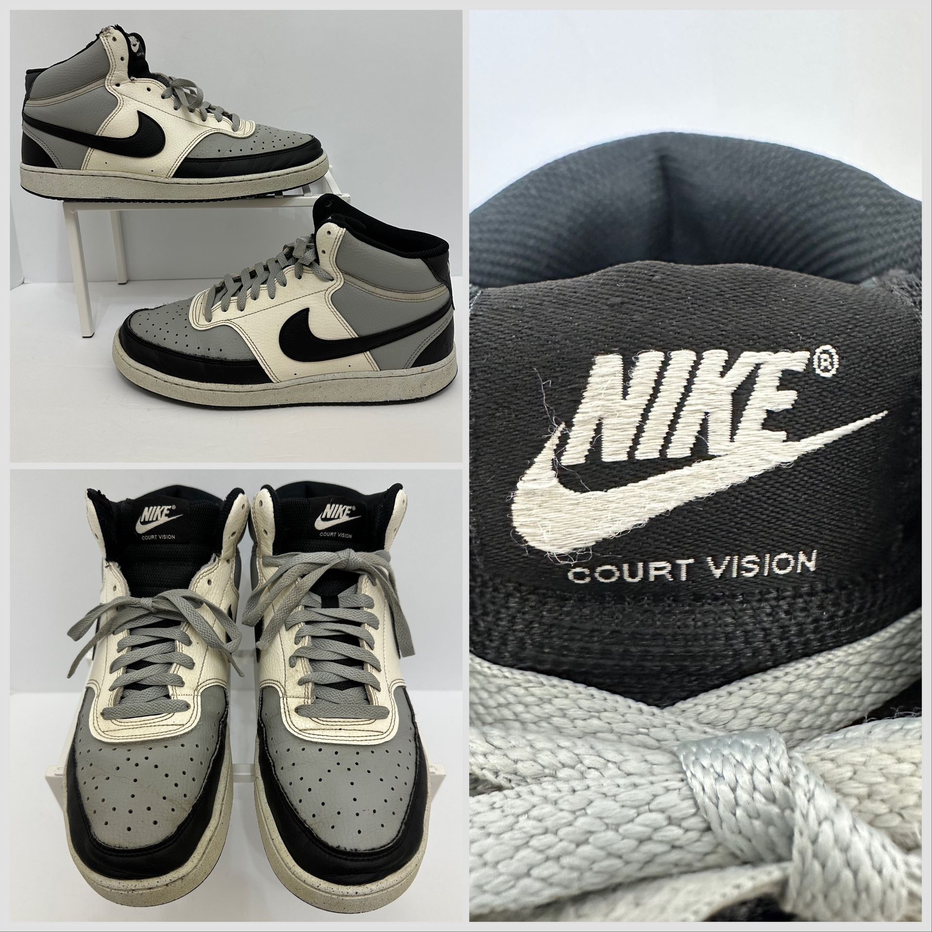 Mens Nike Court Vision Mid Next Nature in light smoke gray/ sail/ black. Size 10. DN3577-002. There is a wear spot by the top of the laces on the right shoe. Otherwise in good condition