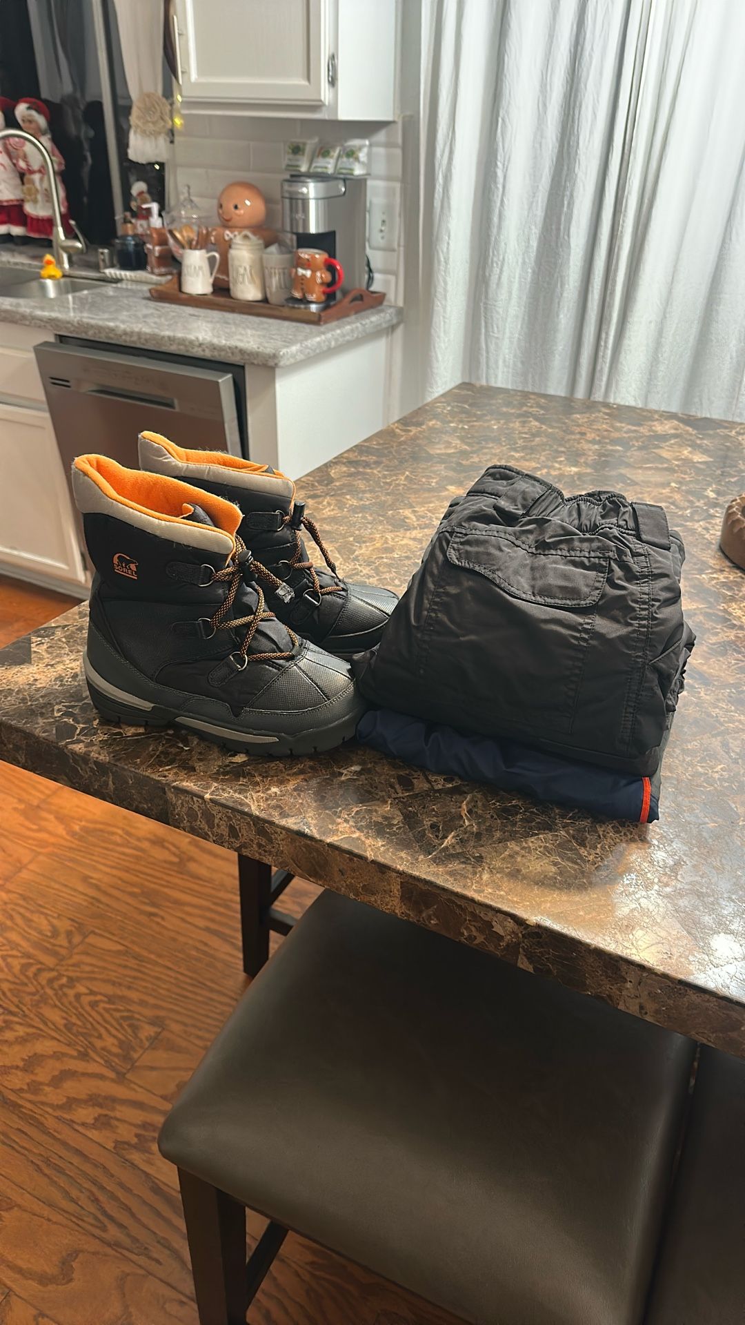 Sorel kids snow boots SIZE 5 (amazing condition) paid over $65 Super warm and keeps the snow out 2 kids pants size M, one is water proof rain pants and the other pair is snow pants, super warm and cozy All in great condition and selling altogether as a set only!! Pick up in Oceanside near the Vista Sports Park, 92056