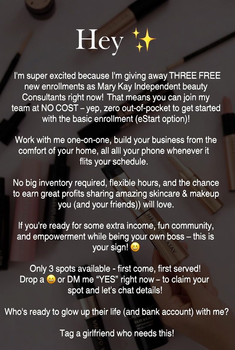 Hi, I’m an Independent Mary Kay Beauty Consultant, and I’m reaching out because I’m building my team and would love to connect with people interested in starting their own flexible beauty business. The Mary Kay eStart program is a straightforward way to get going—it’s a low-cost starter option (around $35 all paid for by me ! , though promotions sometimes bring it lower) that includes business essentials like product samples, educational resources, a personal website for a year, digital tools, and support to help you set up and begin selling. If you’re looking for a side hustle with quality skincare and makeup products, flexible hours, and the chance to earn through personal sales, this could be a great fit. Message me if you’d like more details or to chat about whether it’s right for you—I’d be happy to walk you through it and answer any questions! Looking forward to hearing from you. 😊