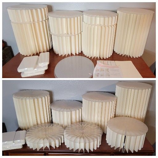 Like new, a total of 11 Stands (4 unopened) Acrylic Toppers, and accessories. $35 for all, pick up only Stands are Stackable, each is 12"w, smallest Stand is 3"h- tallest Stand 16"h Foldable Paper Display Stand, Cylinder Stand for Party Round Cake Pedestal Stands with Acrylic Plates Foldable Cardboard Column Tables for Valentine's Day Anniversary Birthday Baby Shower Wedding Display Decoration Dessert, Display, Riser, buffet, product, bridal, baby shower, decor, photo prop, party decorations, stand, pedestal, rack, folding, step, layer, stacking,