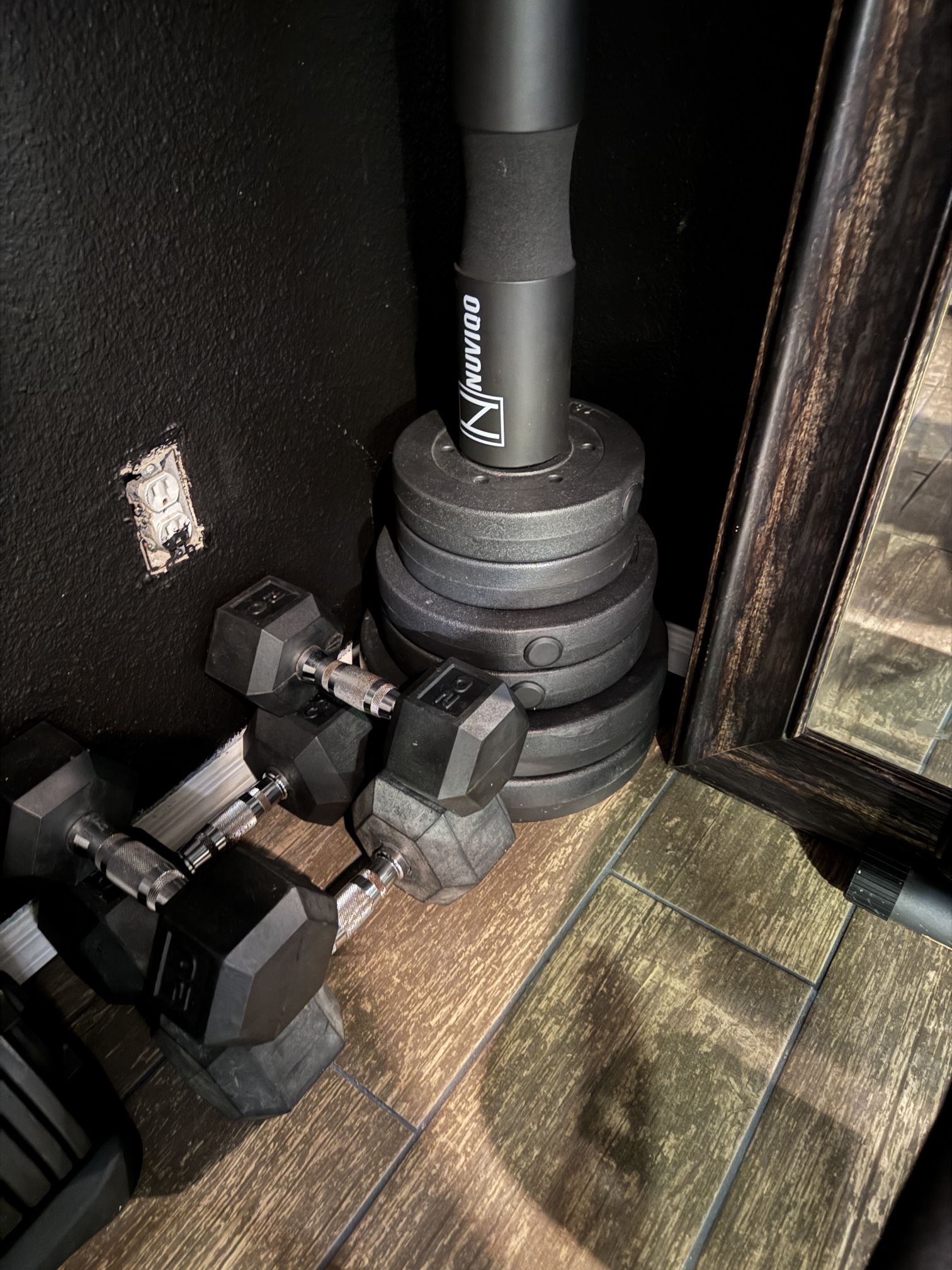 2 Dumbbells of 35 pounds, 2 Dumbbells of 20 pounds, Bar with 2-25 pound plate 2-15 puns plate and 2-10 pound plate. Everything is in great condition