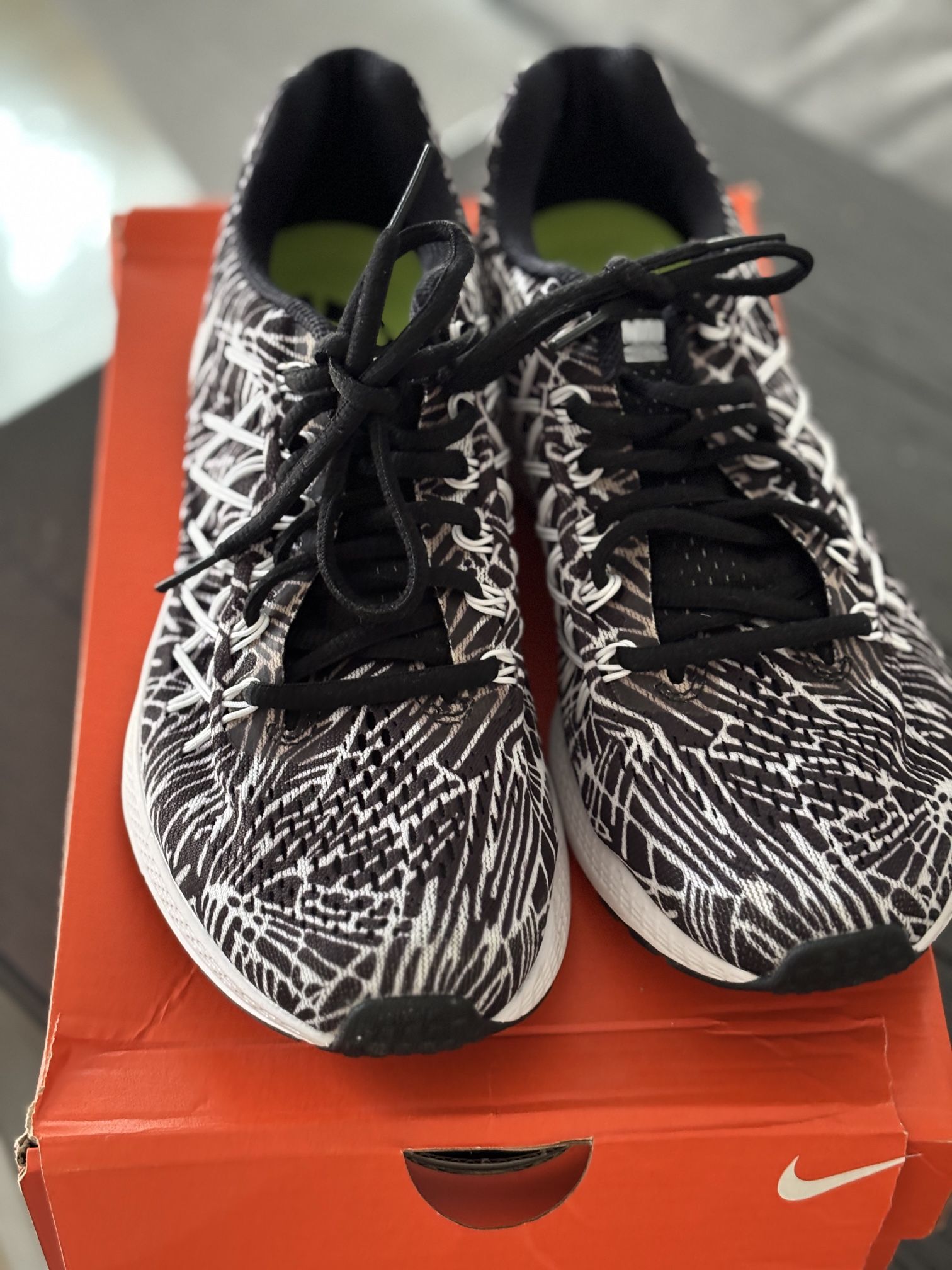 Nike Air Zoom Pegasus 32 Print Running Shoe doesn't have overlays, just a precise, one-piece engineered mesh upper that's reinforced with Flywire cables to deliver support and performance women’s size 8.5 never worn.