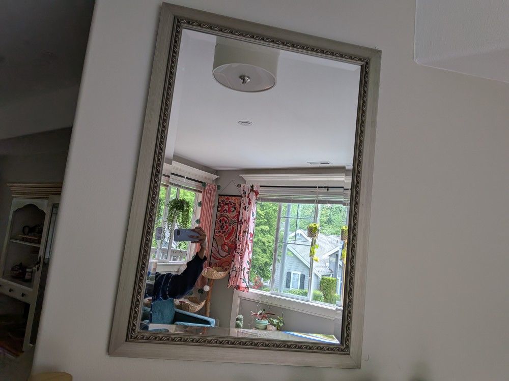 29 by 41 inch. Large hanging mirror in a silver frame.