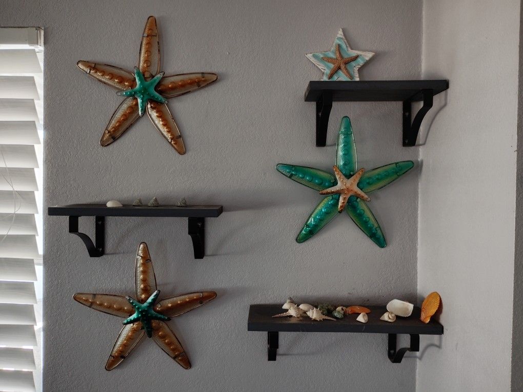Thin metal starfish decor and three black shelves as a bundle All together $20 Starfish by themselves are $8 for all 3 Shelves $17 for all 3