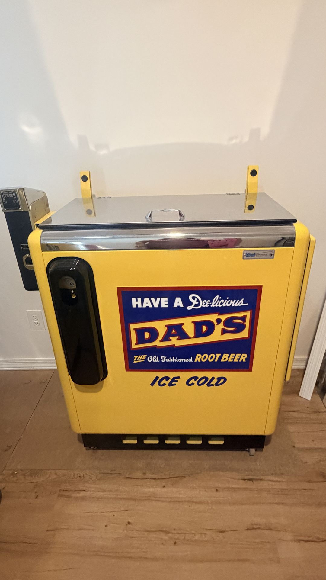 Embossed Dad’s Ideal 55 Slider Soda/Pop Machine for sale $4,500. New compressor, liner, evaporator lines, lid, and new stainless scuff plate. Bottle rack replated. 10 cent vend with either one dime or two nickels. Rejectors are original and work. Located in Chandler, Arizona. Buyer responsible for coordinating shipping and shipping costs.